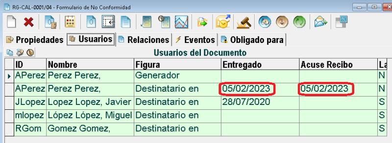Por último, en la pestaña "Usuarios", la columna "Entregado" indica la primera vez que el usuario abrió el documento y la columna "Acuse recibo" indica cuándo el usuario firmó que lo había "Leído y entendido":
