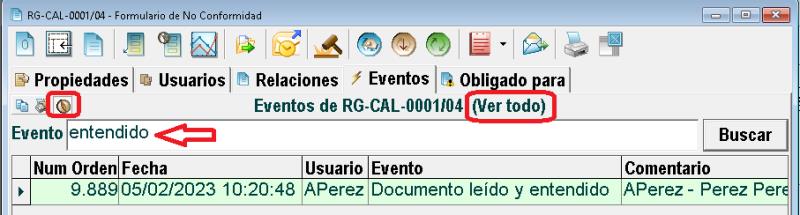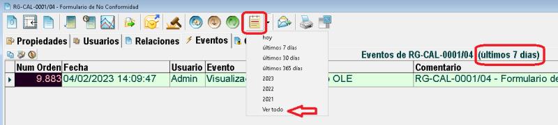 Es cierto que en la pestaña "Eventos" de la ficha del documento, por omisión, aparecen los de los últimos 7 días, pero desde el desplegable del botón "Seleccionar eventos por fecha" se puede obtener un listado más completo: