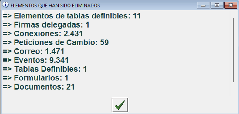 El número total de registros eliminados será muy superior al de elementos eliminados ya que, por ejemplo, eliminar un documento supone eliminar también todas sus relaciones, usuarios, eventos, correo...