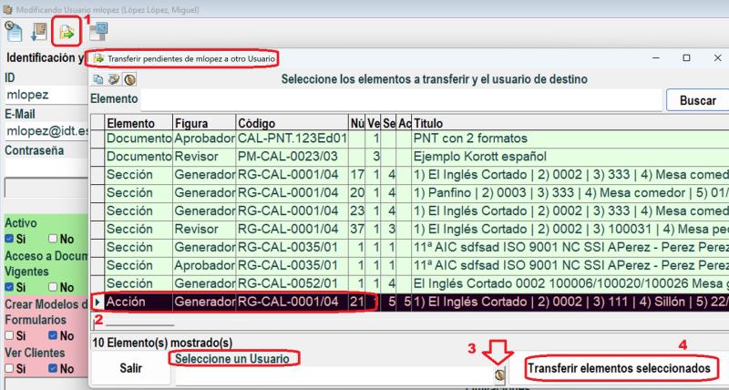 Transferir pendientes a otro usuario2) En la ventana de transferencia, seleccionar la acción a transferir.