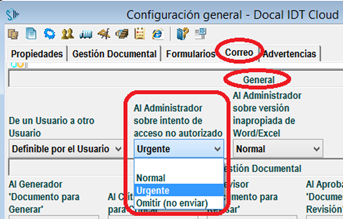 Para dejar de recibir estos avisos de seguridad, se puede hacer desde el menú “Administrador / Configuración general”, en la solapa de “Correo”, apartado “General” se puede cambiar el dato “Al Administrador sobre intento de acceso no autorizado” y poner “Normal” (el aviso queda en la tabla de correo de Docal pero no se envía por email) o bien “Omitir” en cuyo caso no se genera ningún tipo de aviso: