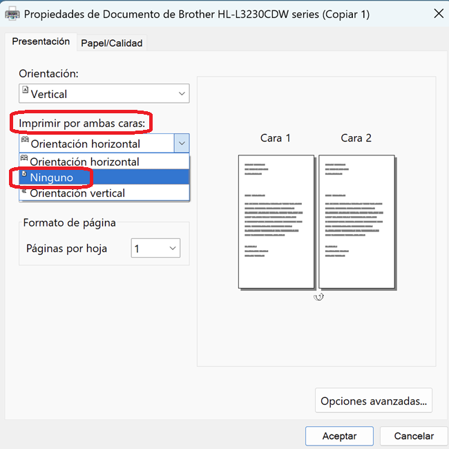 3) En las propiedades de la impresora, configurar impresión a 1 sola cara