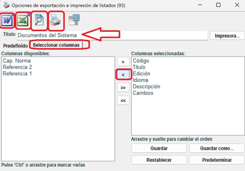 20/03/2025 11:14:41 | Debe ir al Explorador / Documentos y pulsar el botón Opciones de exportación e impresión:  Desde esa ventana, puede: - Escribir un título para el listado