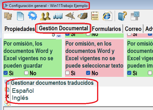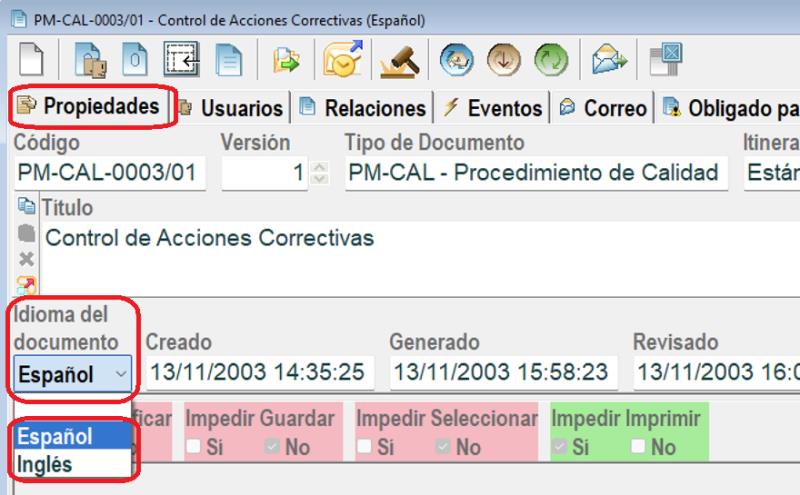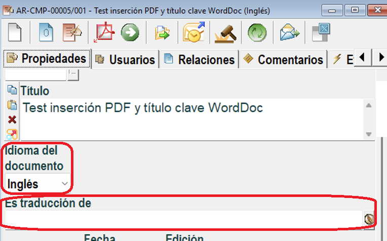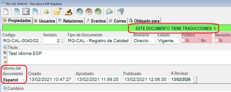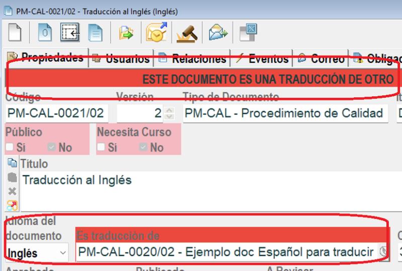 Tras insertar en Docal el documento traducido (que debe tener un código diferente del original), en sus propiedades se puede elegir el idioma de dicho documento y el documento que traduce, por ejemplo: