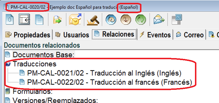 En la pestaña Relaciones se pueden consultar todas las traducciones de un documento: